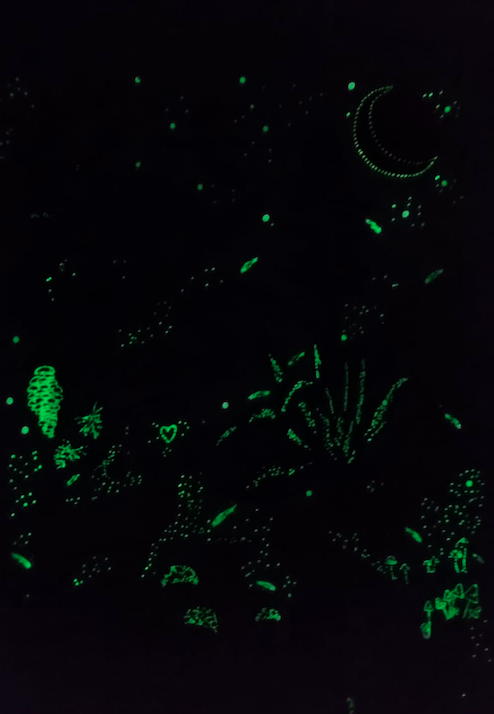 - Ce vêtement s’illumine dans le noir et dévoile des motifs phosphorescents craquants. Pour un effet optimal, bien le laisser exposer à la lumière au préalable.